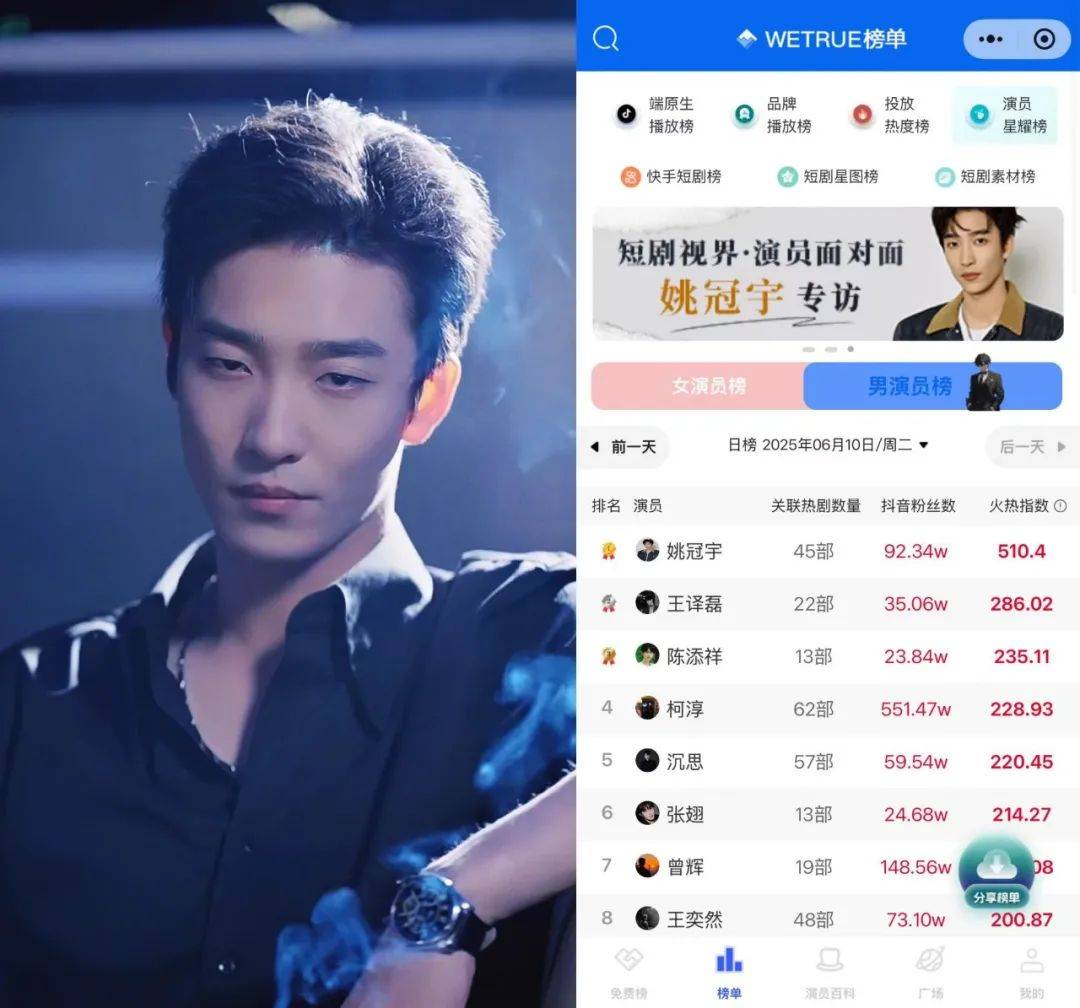 男主角姚冠宇借此迅速蹿红,力压柯淳,被冠以新“短剧一哥”之名。WeTrue演员星耀榜数据显示,截至发稿,姚冠宇火热指数高达510.4,抖音粉丝92.34万,关联热剧45部,断层领先。